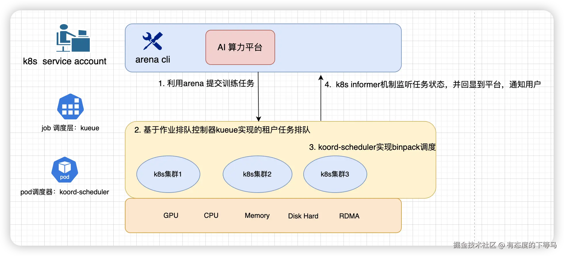 今天我们记录聊一聊平台侧另一个核心能力: 动态纳管云原生k8s集群,并监听AI/ML训练任务的状态变化。也就是上图的第4步。