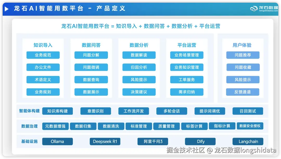 龙石数据 AI 智能用数平台 V1.0 创新性地运用数据中台的建设成果,结合大语言模型(如 DeepSeek 等)技术,用户仅需一句话即可完成自助式、智能化的实时数据查询分析与可视化呈现。该平台首创元数据增强技术,依托用数知识库攻克数据识别难题,以可视化方式向用户呈现数据查询结果,大幅降低了数据使用人员的时间成本。经测试,AI 智能用数平台基于知识库的回答准确率达 100% ,AI 自动查数准确率达 95% 。