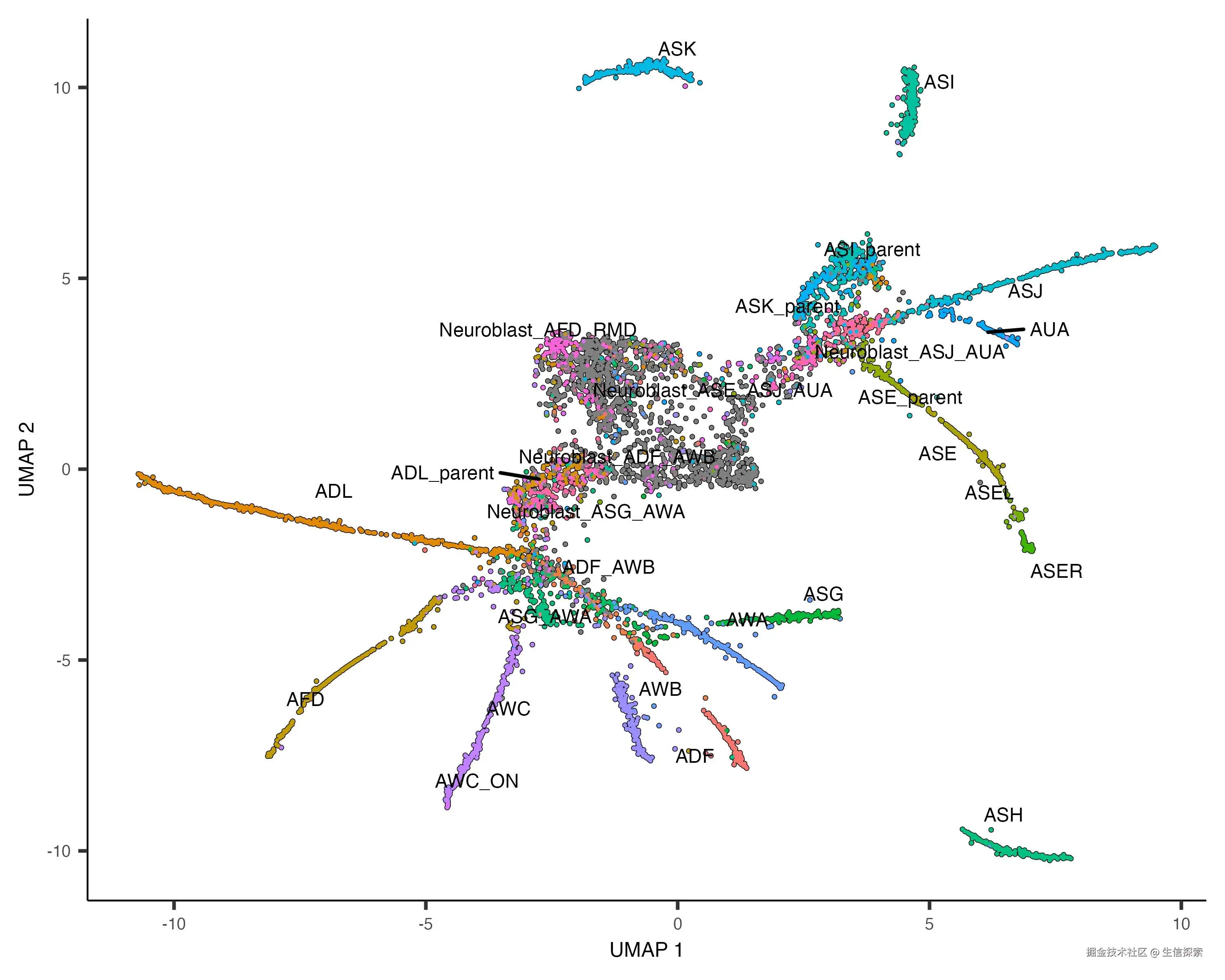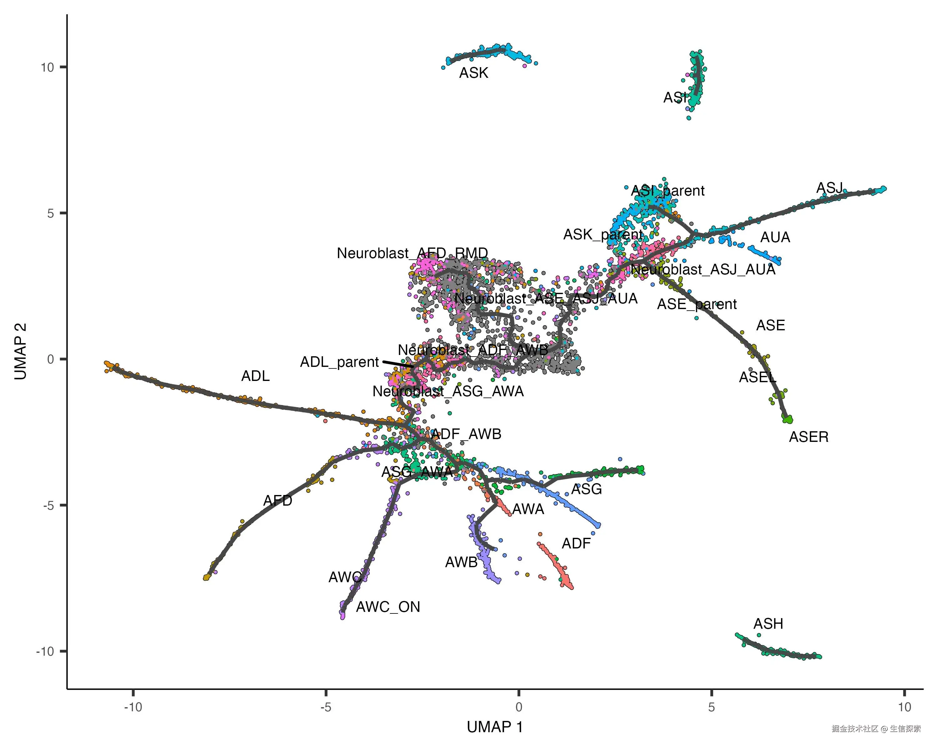 通过这一步骤,我们可以初步观察到数据中存在的轨迹结构,以及不同细胞类型在轨迹上的分布。