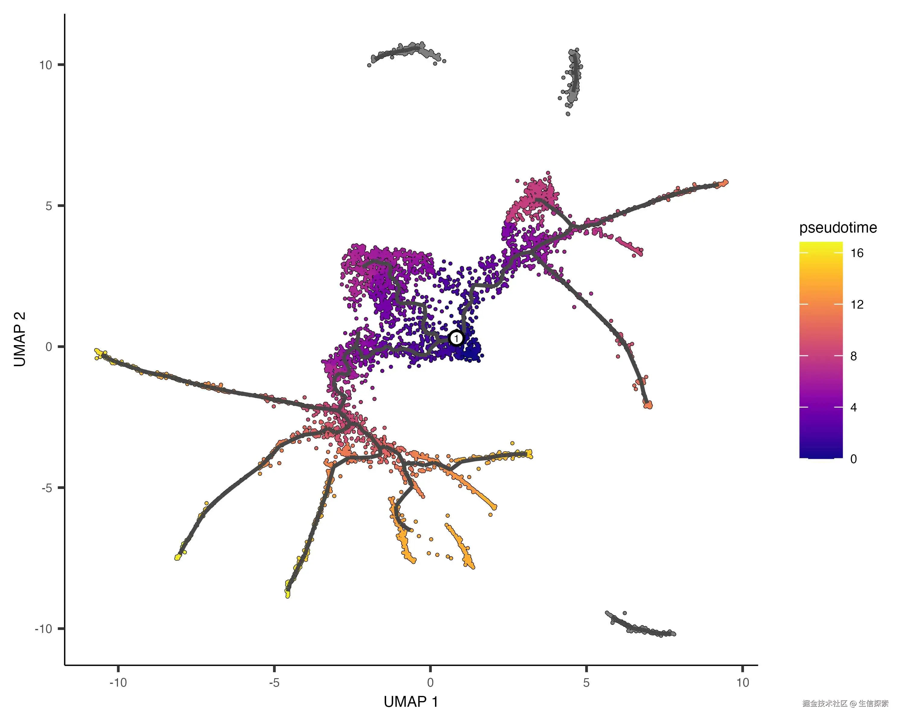 值得注意的是,未从根节点可达的细胞会被分配无限伪时间(显示为灰色),因此通常应为每个分区至少选择一个根节点。