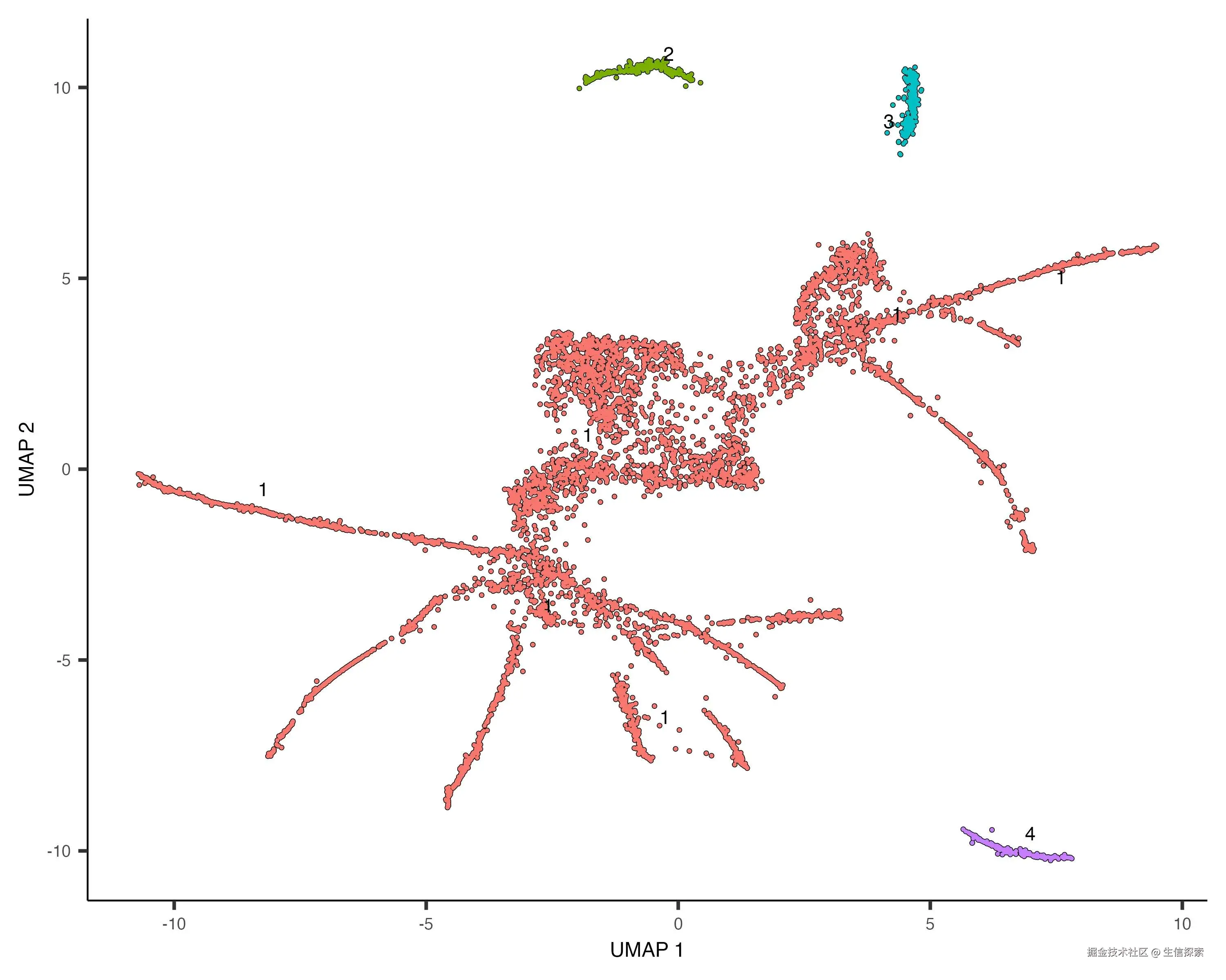 与聚类分析类似,使用cluster_cells()函数对细胞进行聚类。在轨迹分析中,每个细胞不仅被分配到一个聚类,还会被分配到一个分区(partition),每个分区最终会形成一个独立的轨迹。