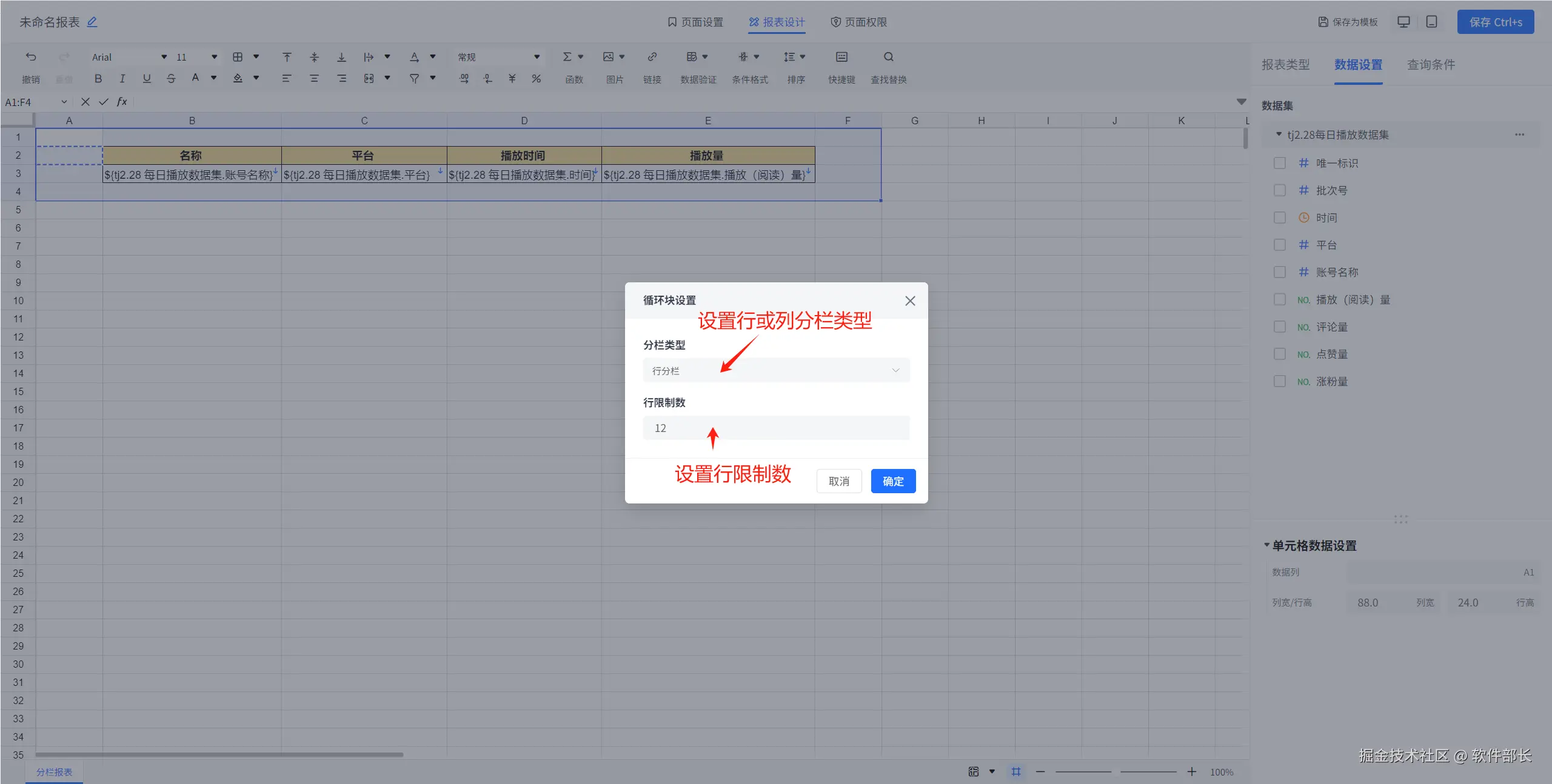 4、设置字段拓展方向,需注意的是 每个字段拓展方向得始终保持一致,如果是行分栏所有字段拓展方向应设置为纵向,如果是列分栏则所有字段拓展方向应该设置为横向。