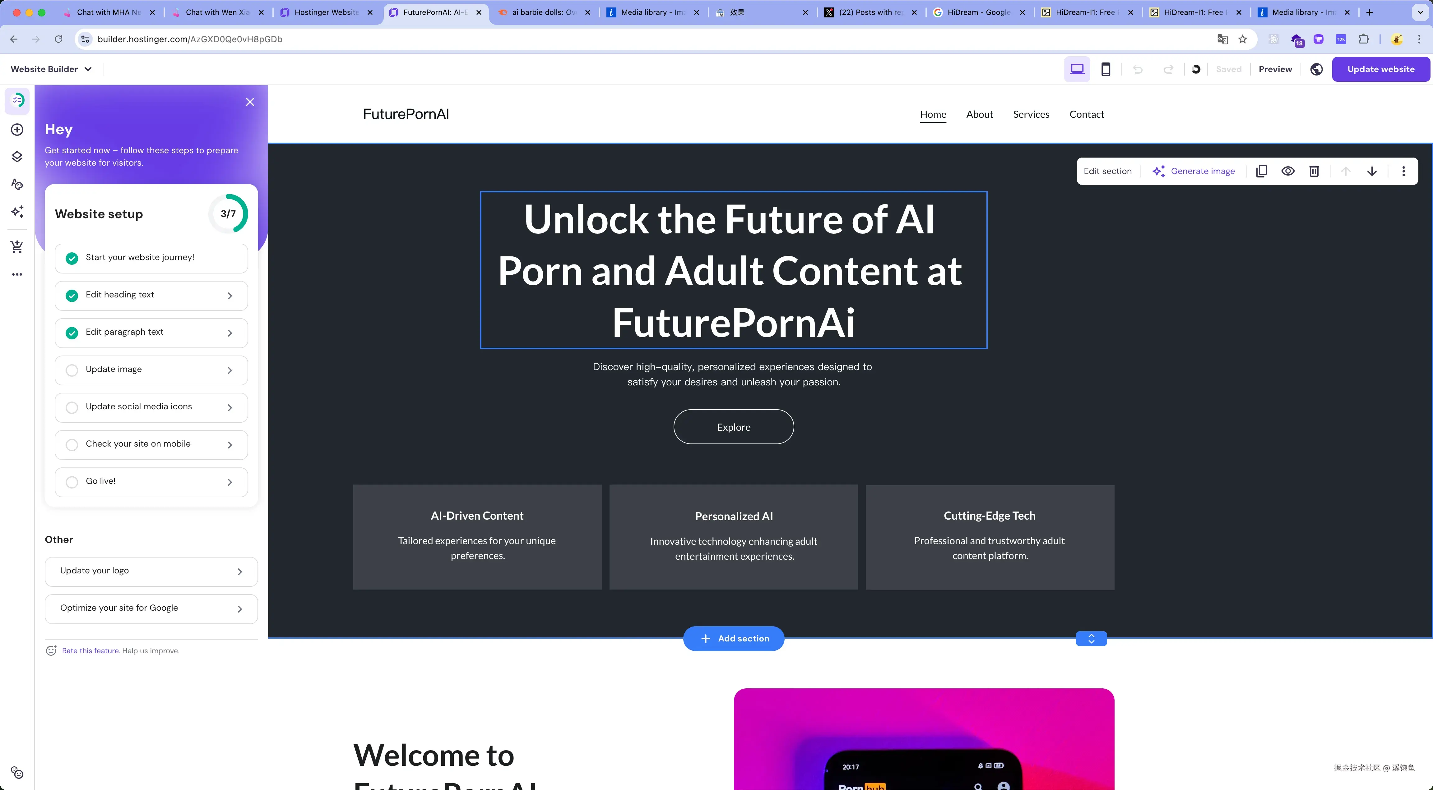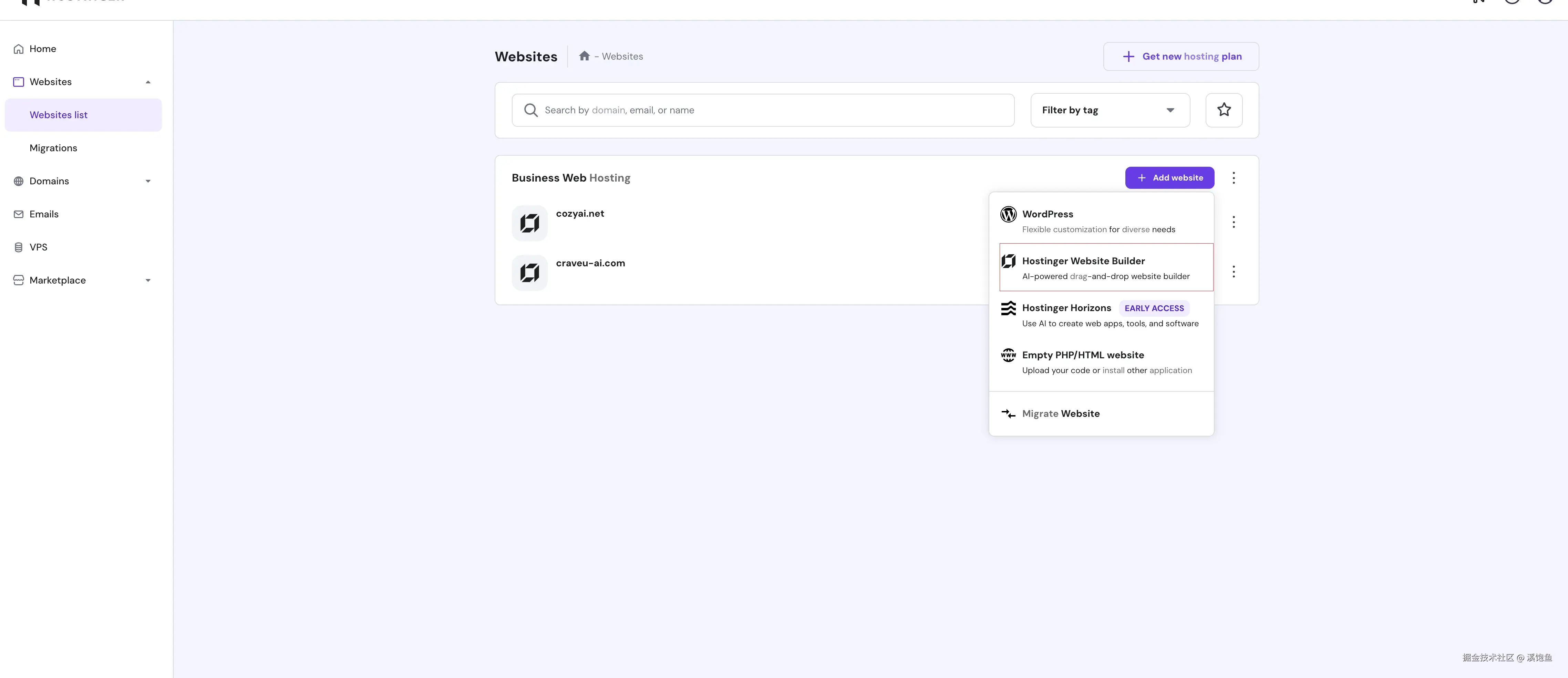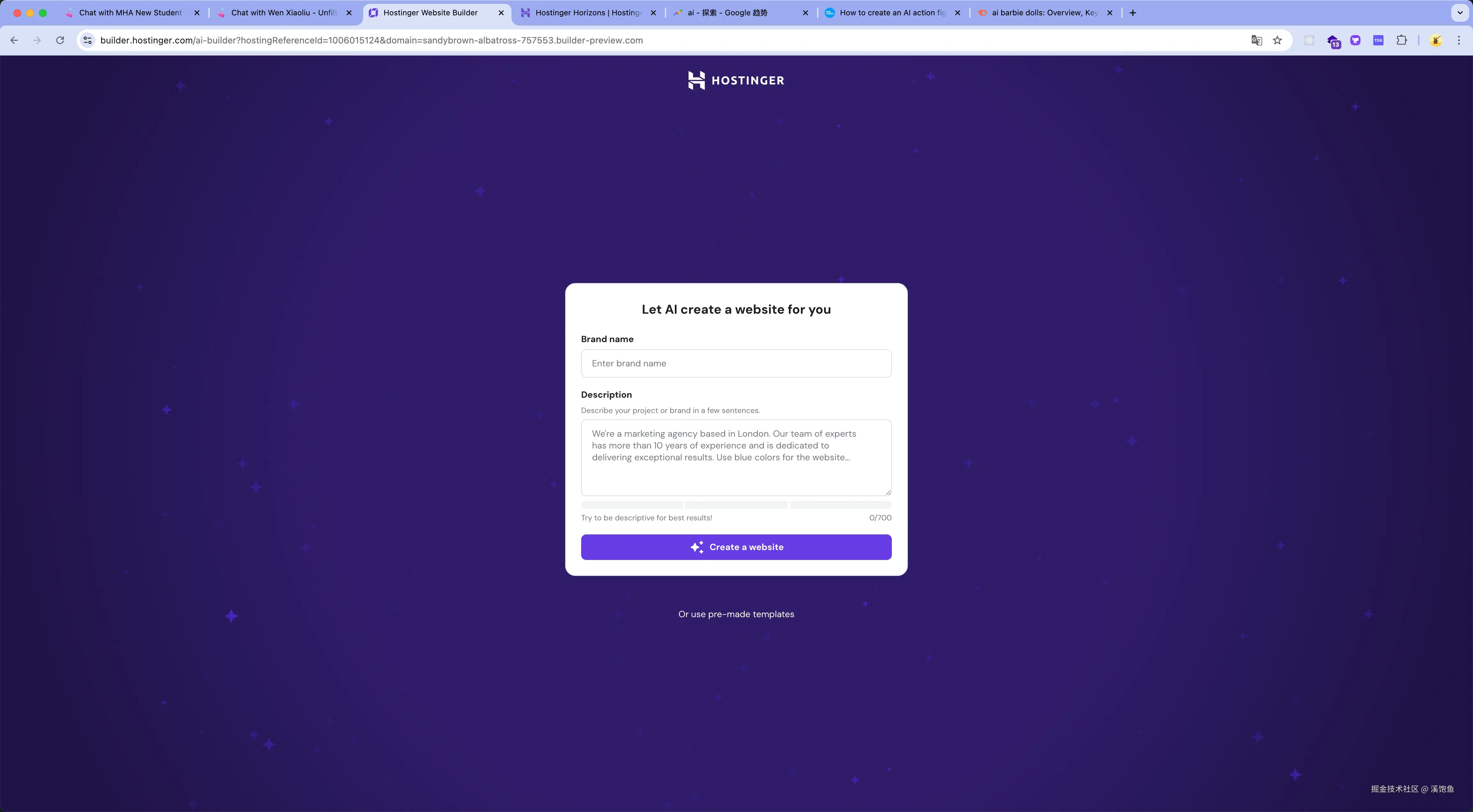 hostinger是一个快速建站的平台,他可以通过AI建站。一年300块,可以建50个站。