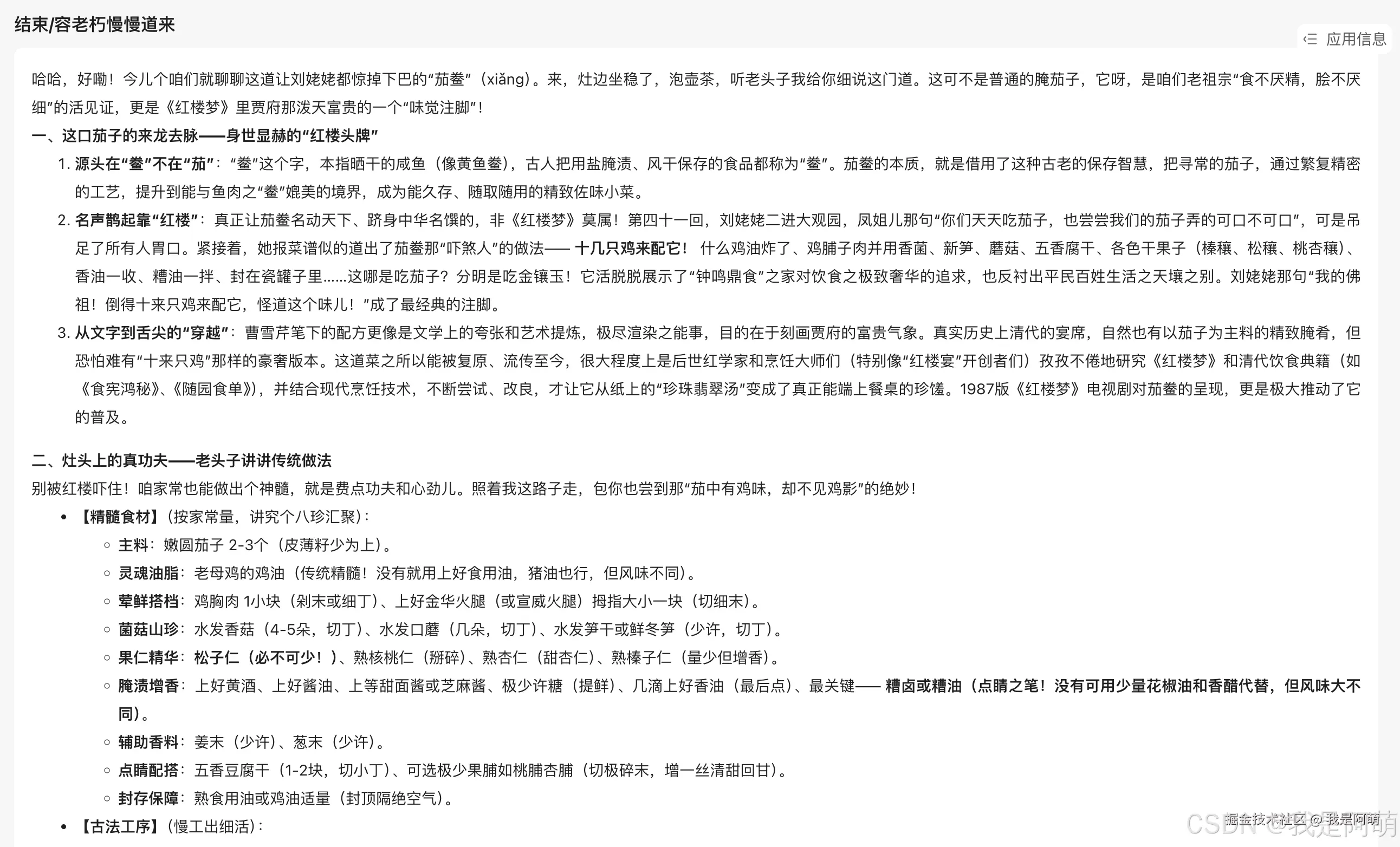 “古食记” 的使用体验十分出色。用户只需输入想了解的古典名著中的名吃名菜,比如 “《红楼梦》里的茄鲞”,智能体就会以一位慈祥老人的口吻娓娓道来:“哈哈,好嘞!今儿个咱们就聊聊这道让刘姥姥都惊掉下巴的“茄鲞”(xiǎng)。来,灶边坐稳了,泡壶茶,听老头子我给你细说这门道。……”
