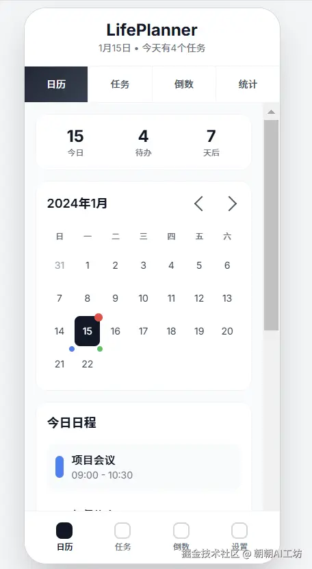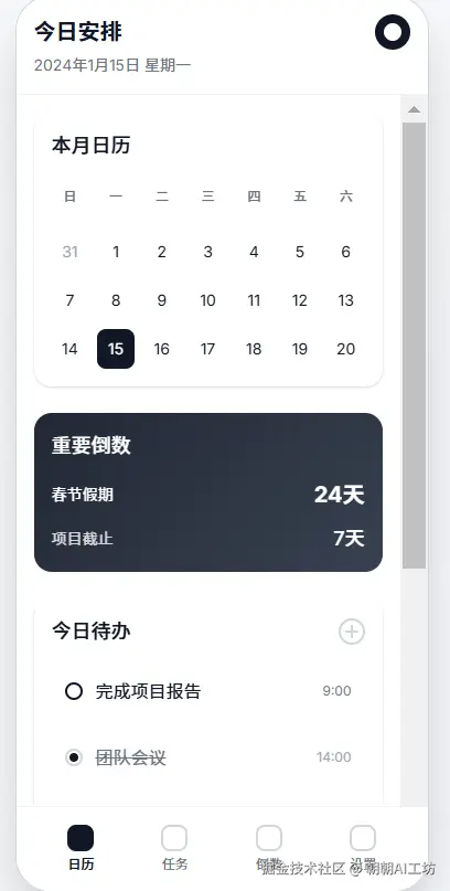 我给了一个日历+清单+代办+倒数日的需求,生成了三种高颜值风格UI