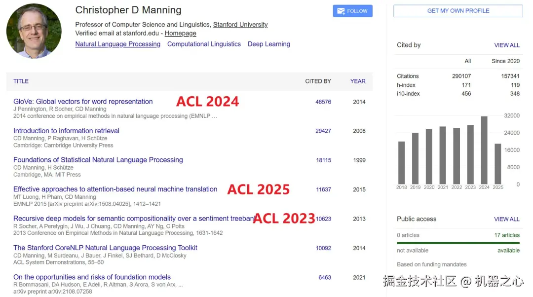 至于最后的 Manning 教授更是无需过多介绍了,这位引用量已经超过 29 万的学术巨擘为 NLP 和 AI 领域做出了非常多开创性和奠基性工作,同时还在教育和人才培养方面出了巨大贡献。
