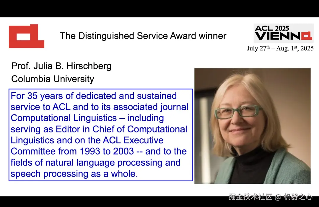 ACL 2025 还颁发了一个杰出服务奖(Distinguished Service Award),旨在表彰对计算语言学界做出杰出且持续贡献的人。