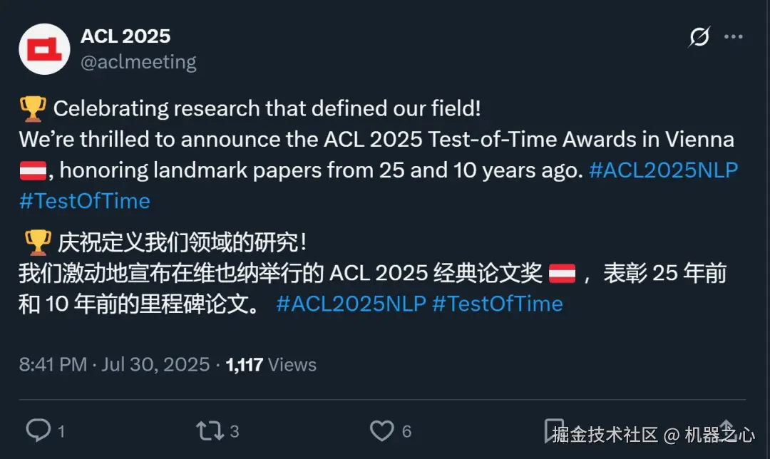 今年,ACL 宣布了两个时间检验奖: 25-Year ToT Award (2000) 和 10-Year ToT Award (2015),即二十五年时间检验奖和十年时间检验奖。