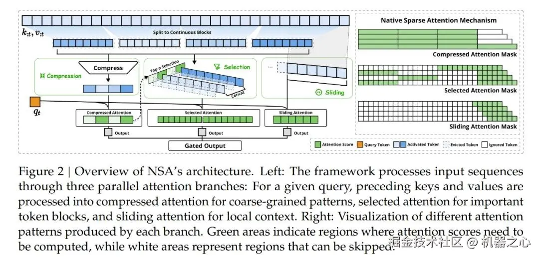 如下图所示,NSA 通过将键和值组织成时间块(temporal blocks)并通过三条注意力路径处理它们来减少每查询计算量:压缩的粗粒度 token、选择性保留的细粒度 token 以及用于局部上下文信息的滑动窗口。随后,作者实现了专门的核以最大化其实际效率。