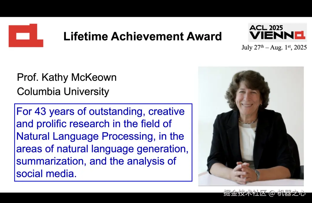 本年度 ACL 终身成就奖的获得者是 Kathy McKeown 教授。