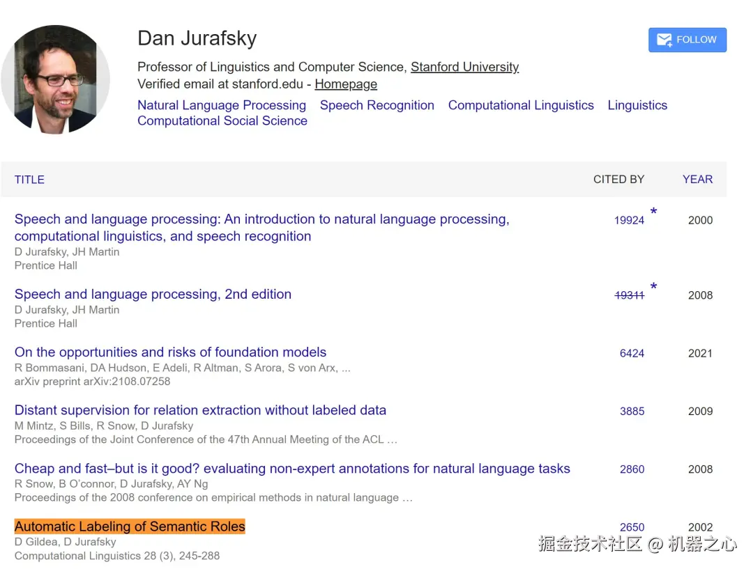 该论文的两位作者 ——Daniel Gildea 现在是美国罗切斯特大学计算机科学系的教授;Daniel Jurafsky 是斯坦福大学语言学和计算机科学系教授,也是自然语言处理领域的泰斗级人物,他与 James H. Martin 合著的《语音与语言处理》(Speech and Language Processing)被翻译成 60 多种语言,是全球 NLP 领域最经典的教科书之一。