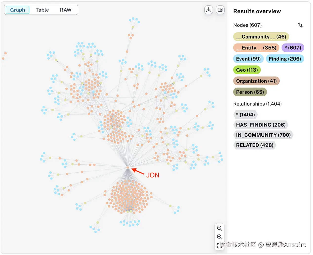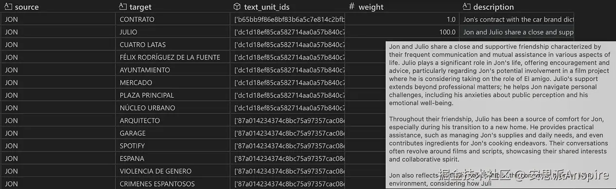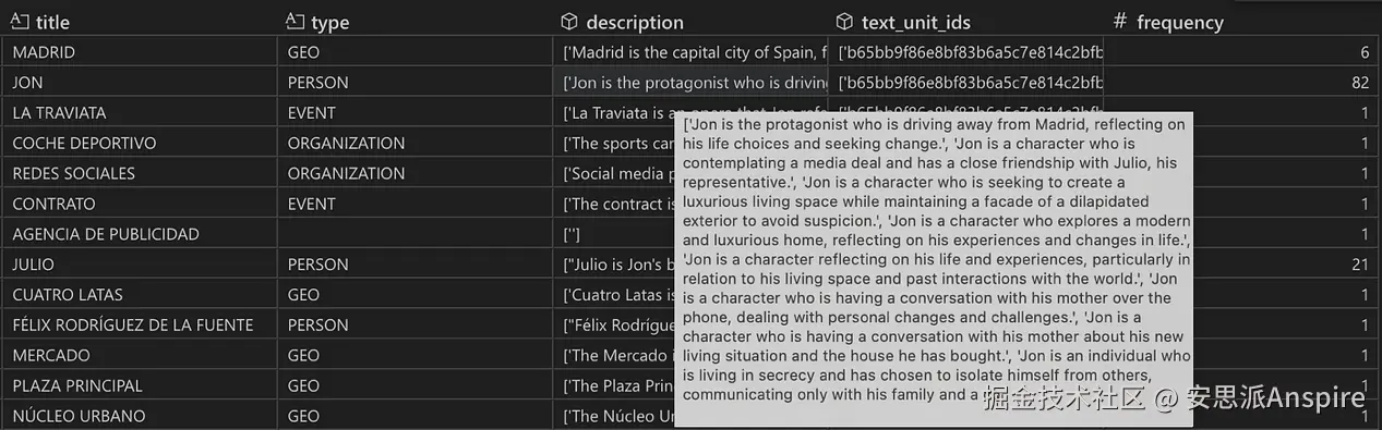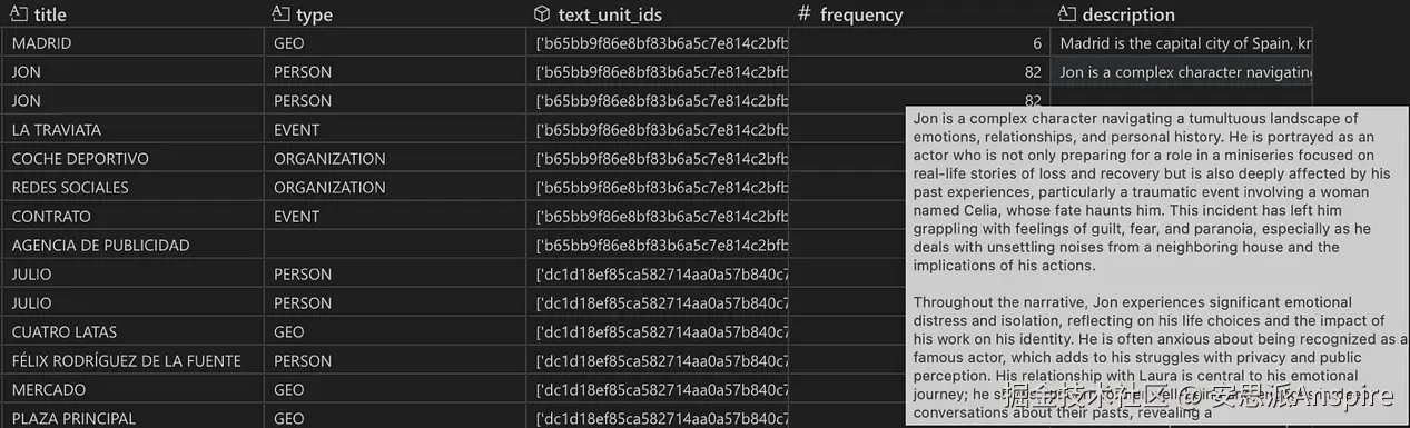实体表快照。实体按实体名称和类型分组。从频率列可以看出,实体Jon被提取了82次。text_unit_ids列和description列分别包含82个ID和描述的列表,显示Jon在哪些块中被识别和描述。默认情况下,有四种实体类型(地理、人物、事件和组织)。