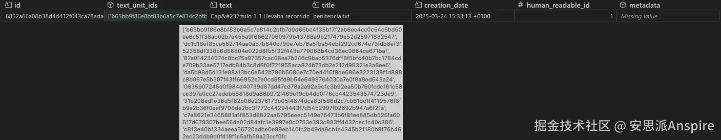- 在create_final_documents模块中,会创建一个查找表,用于将文档映射到其关联的文本单元。每一行代表一个文档,由于我们只处理一个文档,因此只有一行。