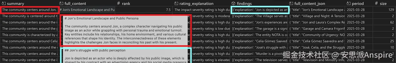 图为包含LLM生成的报告(full_content列)和报告摘要(summary列)的社区表快照。报告文本是摘要(红色)和发现(蓝色)的组合。rank列和rating_explanation列分别包含LLM为该社区分配的重要性值(1到10之间)以及对所选数值的理由说明。