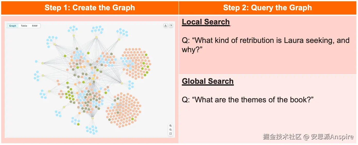 它有多种实现方式,这里我们重点介绍微软的方案。其主要可分为两个步骤:图构建(即索引构建)和查询(查询有三种方式:本地搜索、全局搜索和漂移搜索)。