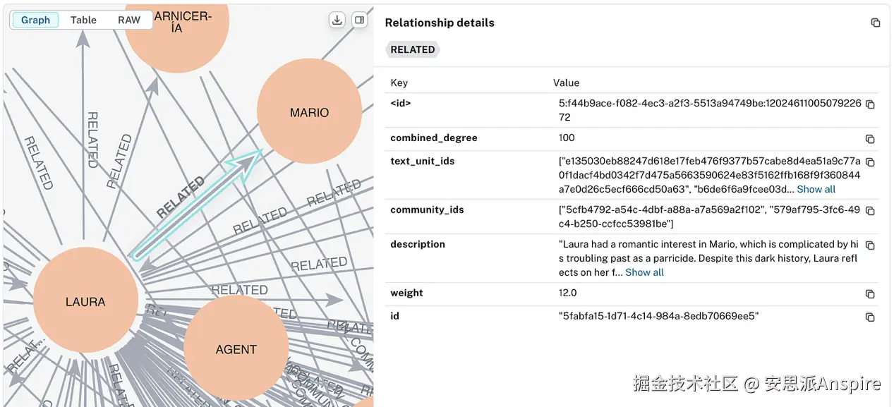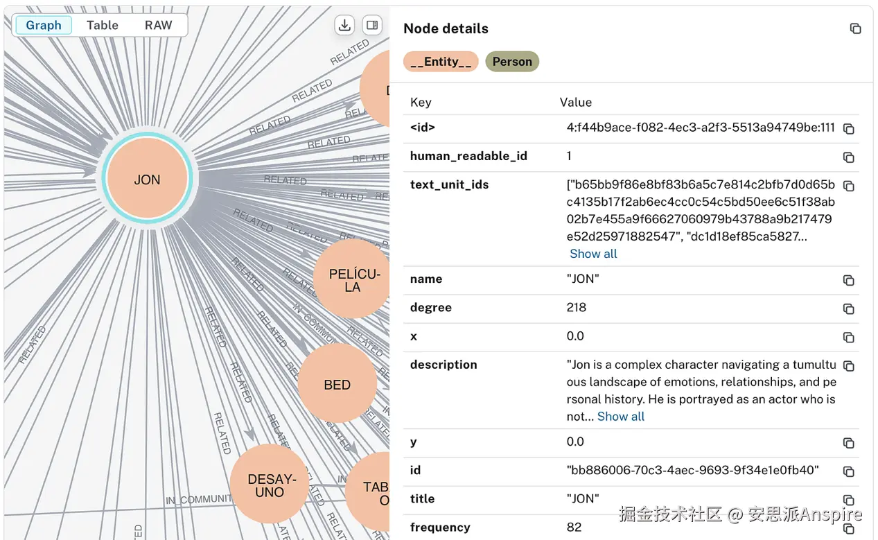 如你所见,去重有时并不完美。此外,GraphRAG不处理实体消歧(例如,Jon和Jon Márquez尽管指的是同一个人,也会是不同的节点)。