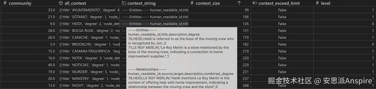 报告生成前中间步骤的表格快照。对于每个社区,所有实体和关系都会被收集起来,然后整理成一个字符串,作为上下文传递给LLM。context_exceed_limit列会在context_string需要缩短时向算法发出警报。