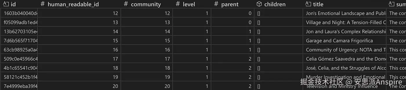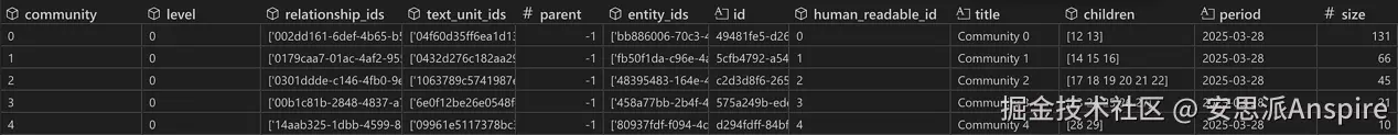 社区表快照。社区0是层级0的社区,因此是根社区(没有父社区)。从子社区(children)列可以看出,它有两个子社区。该社区包含的所有关系、文本单元和实体分别在相应列中列出。大小(size)列显示该社区由131个实体组成。