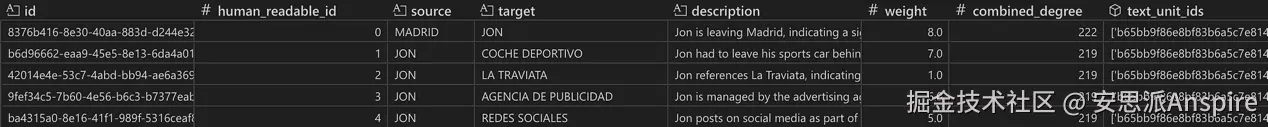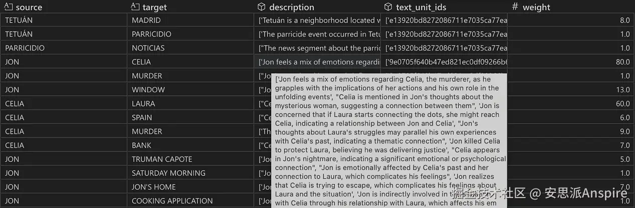 关系表快照。关系按源实体和目标实体分组。对于Jon和Celia,description列和text_unit_ids列各包含14个条目的列表,表明这两个角色在14个不同的文本块中被识别出存在关系。weight列显示LLM分配的关系强度之和(权重不是源节点和目标节点之间的连接数量!)。