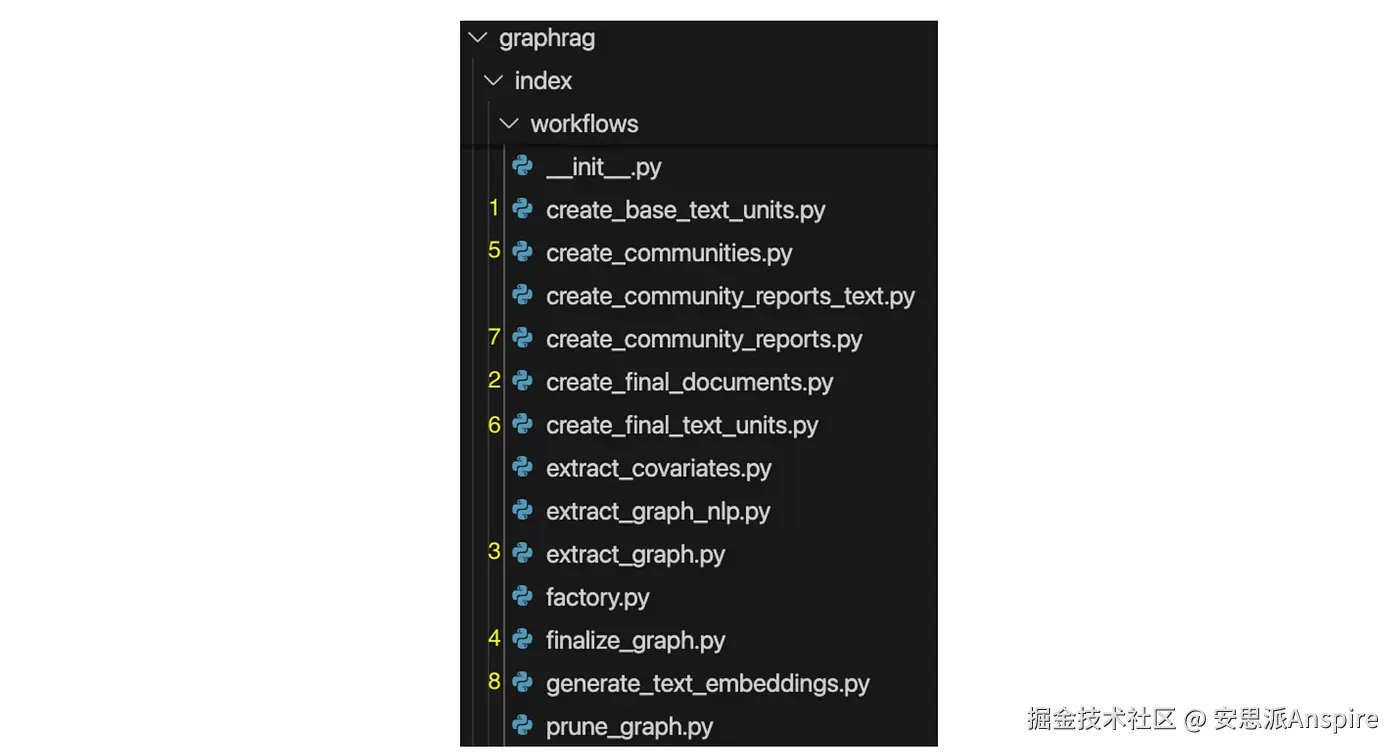 这会触发两个关键操作:从源文档中提取实体,以及将图划分到社区,这两个操作在 GraphRAG 项目的 workflows 目录的模块中定义。