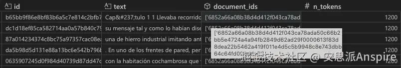 按ID展示所有文档的表格。对于每个文档,所有关联的块(即文本单元)都按其ID列出。