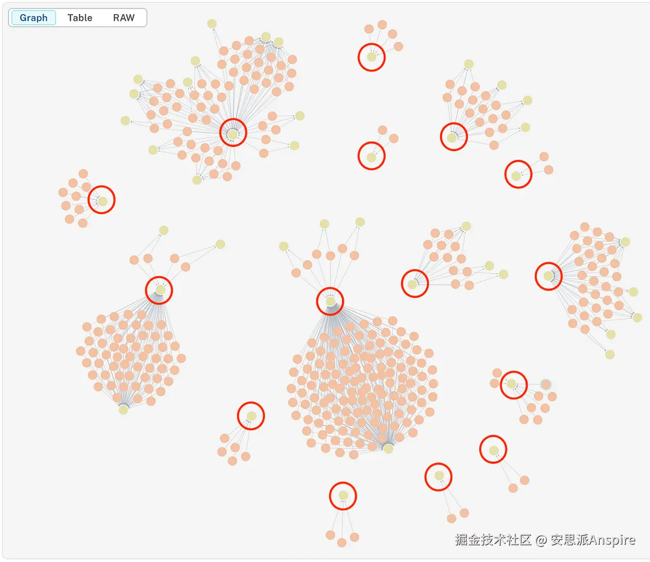 过滤出IN_COMMUNITY关系后,《Penitencia》的图显示出15个根层级社区(红色圆圈)