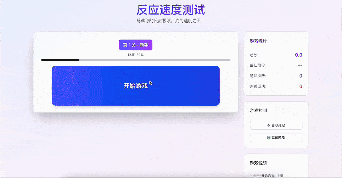 1、游戏机制:点击开始→等待变色→尽快点击→查看成绩,并设计了2-6秒随机等待时间,防止玩家预判。