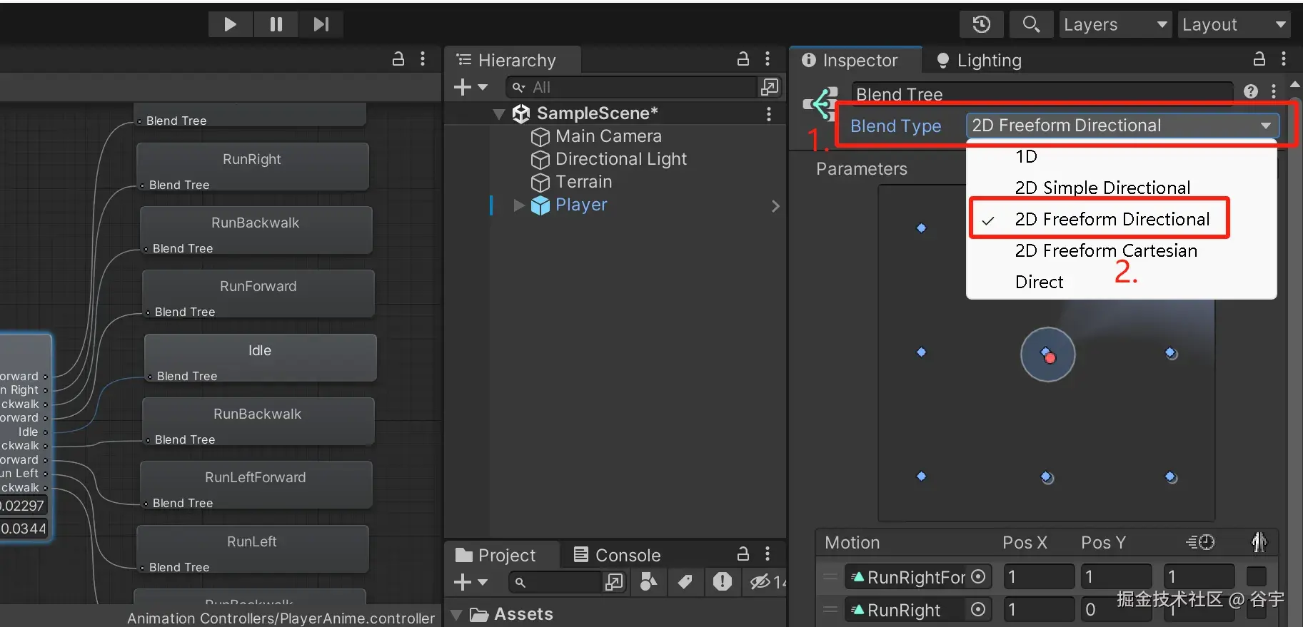 2.双击打开Blend Tree的节点。接着Blend Tree的类型我们选择“2D Freeform Directional”。