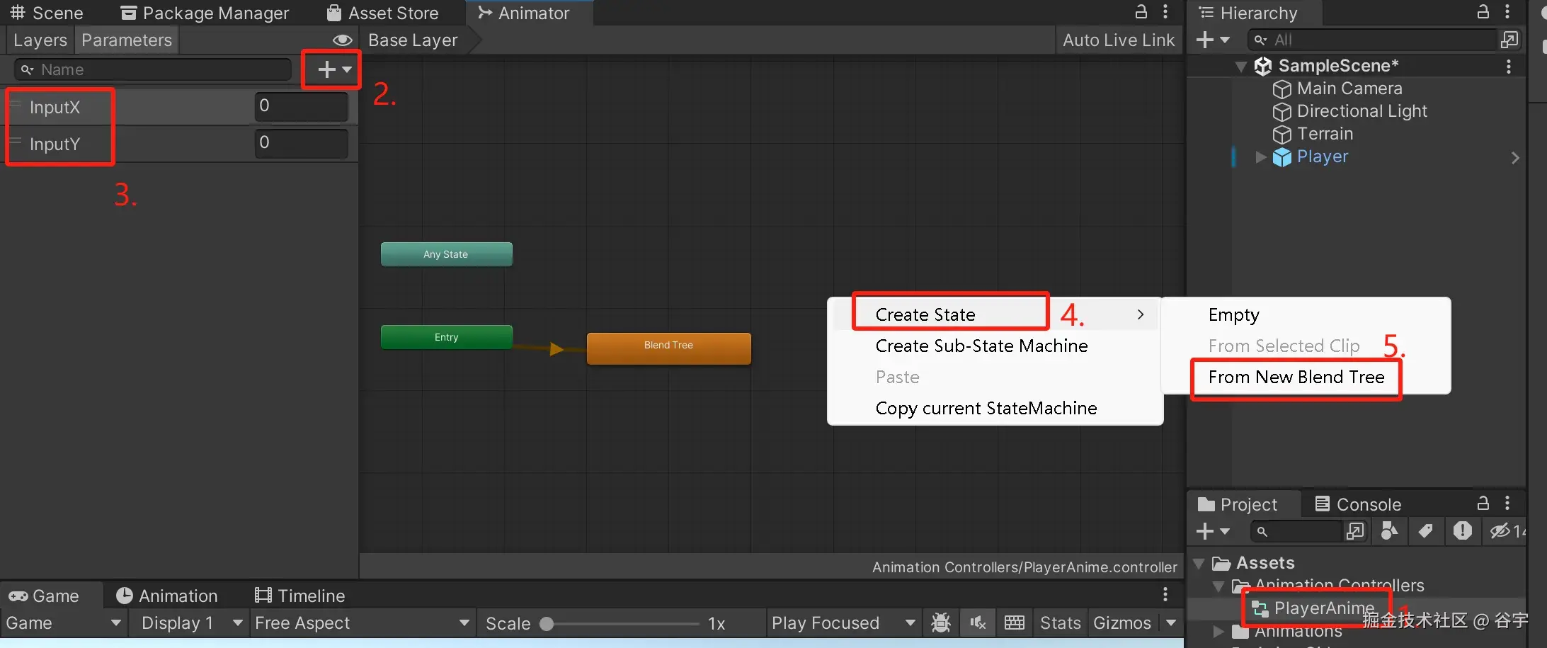 1.首先,我们将定义两个新的变量,InputX和InputY,它们将用于操纵BlendTree,实现角色的移动控制。随后,我们将构建一个新的Blend Tree来响应这些输入。