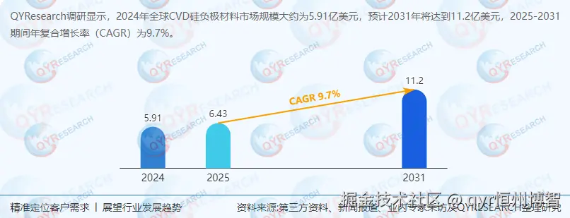 根据QYResearch最新调研报告显示,2024年全球CVD硅负极材料市场规模达5.91亿美元,预计2031年将增至11.2亿美元,2025-2031年复合增长率(CAGR)为9.7%。中国市场增速显著,2024年全球占比约X%,预计2031年占比将提升至Y%,成为全球增长核心驱动力之一。