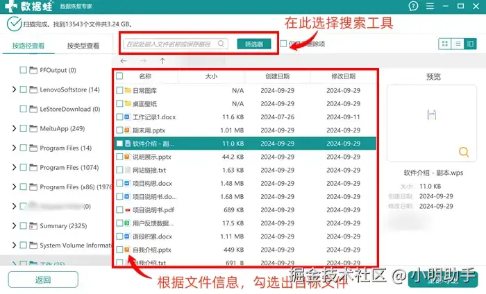 提示:如果找不到文件也不用灰心,上方的【筛选器】、【搜索框】可以帮助我们定位目标文件,排除无关文件。