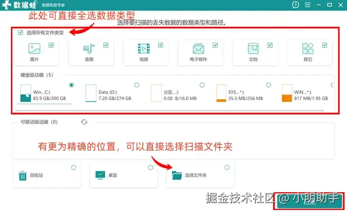 步骤1: 在首页中,用户可以根据自己的需求选择需要扫描的文件类型,再选择需要扫描的磁盘,做好扫描准备后再点击按键让软件开始进行扫描。