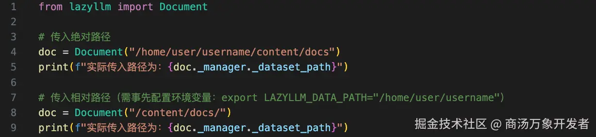 # RAG 文档读取from lazyllm import Document # 传入绝对路径doc = Document("path/to/content/docs/")print(f"实际传入路径为:{}") # 传入相对路径doc = Document("/content/docs/")