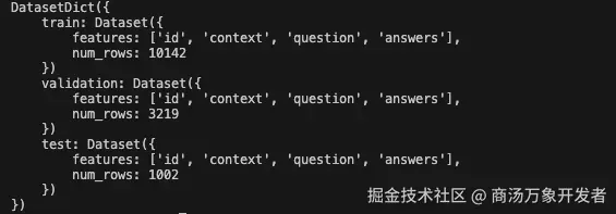 上述代码会将数据集自动下载到.cache/huggingface/datasets 目录下,如果您希望指定下载路径,可以通过 cache_dir 参数来指定。下载成功后我们将看到如下格式的输出: