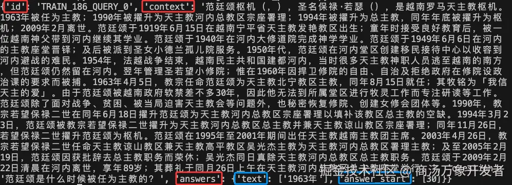 对于每条数据,包括 id,context,question 以及 answers 四个字段,其中 id 是当前数据的编号,context 是一段文字性描述,涉及历史、新闻、小说等各领域,answer 包括两部分,一部分是 answer_start,标志答案从哪个 context 中的 token 开始,另一部分是 text,代表了针对 question 给出的答案,此答案由人类专家给出,上图中有两个答案,代表人类专家 1 和人类专家 2 分别给出,以此来保证答案的准确性。