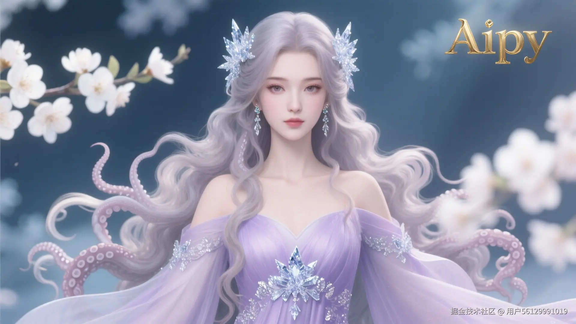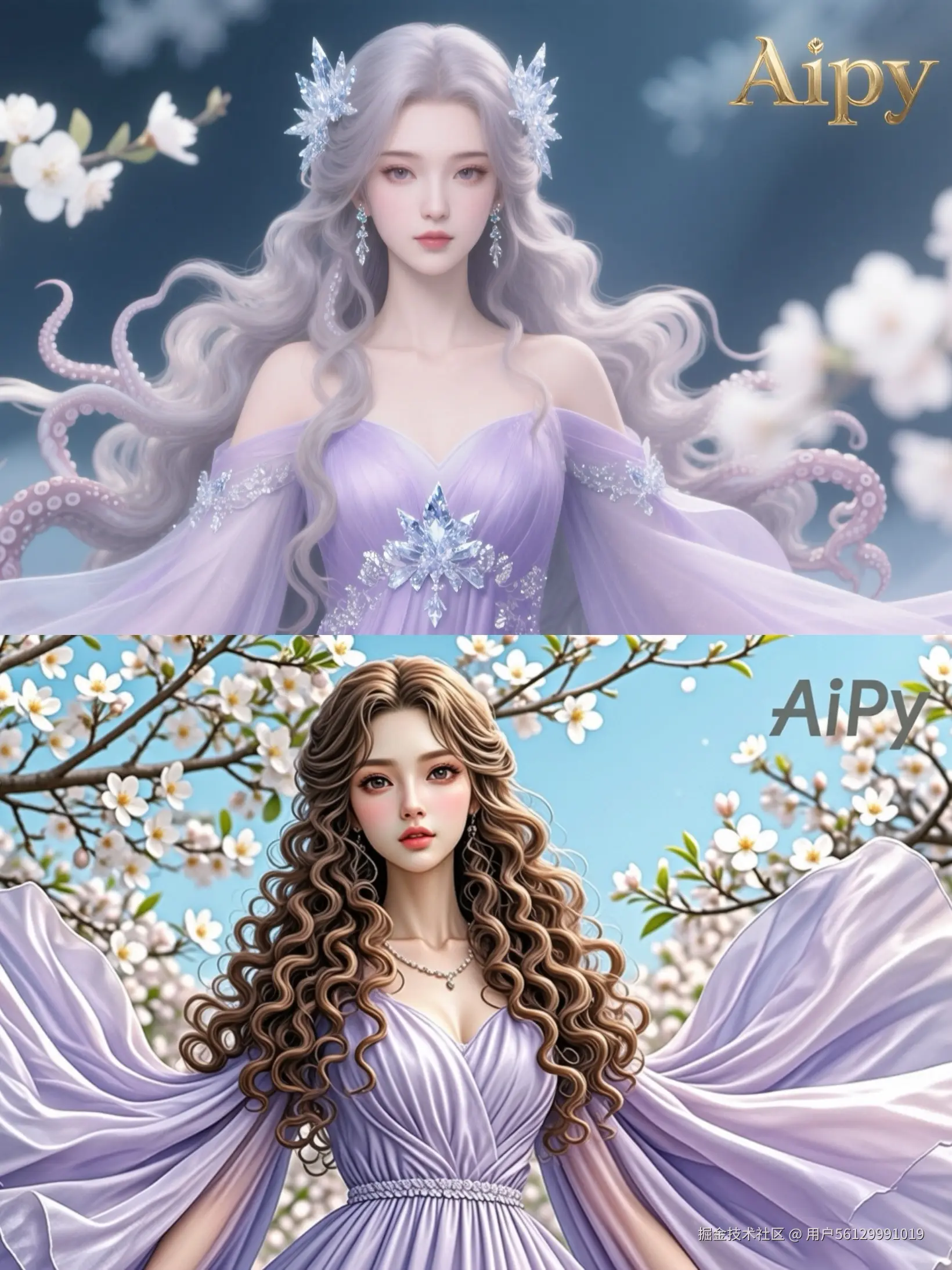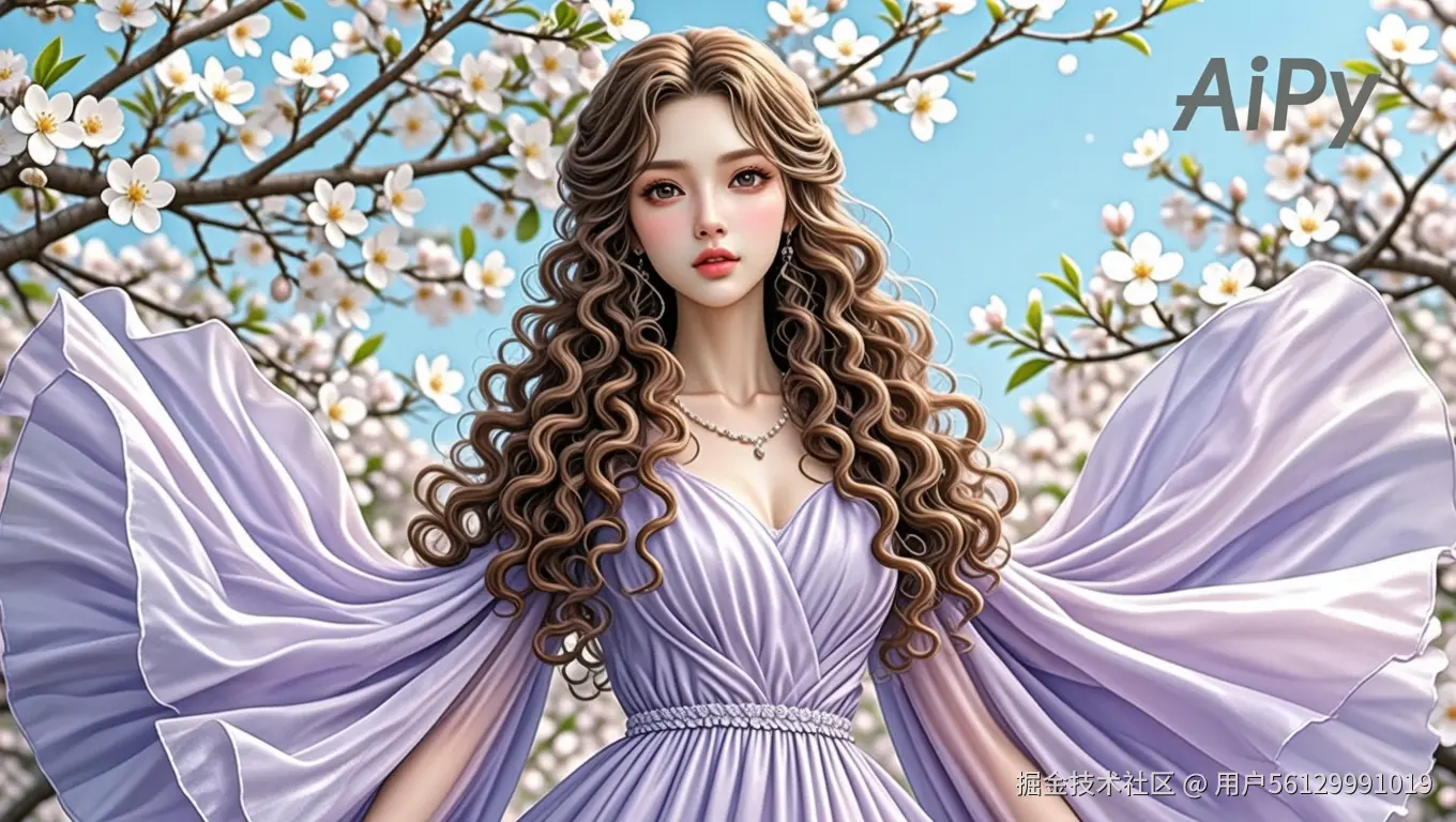 生成两张CG厚涂风格的电脑壁纸,保存到桌面,要求:3D,超真实细腻肌肤,她有着一头长长的卷成章鱼须的头发,戴着冰雪饰品,增添了几分柔美与浪漫。目光柔和,面容精致,嘴唇微微泛红,表情温婉恬静。她身着淡紫色仙裙,衣袖宽大飘逸,长发披肩,碎发拂面,长发飘逸,梨花背景。全身图。在她的右上方有标识AiPy