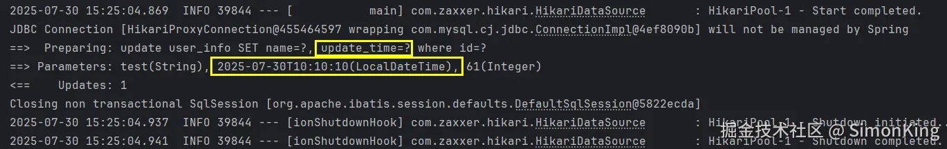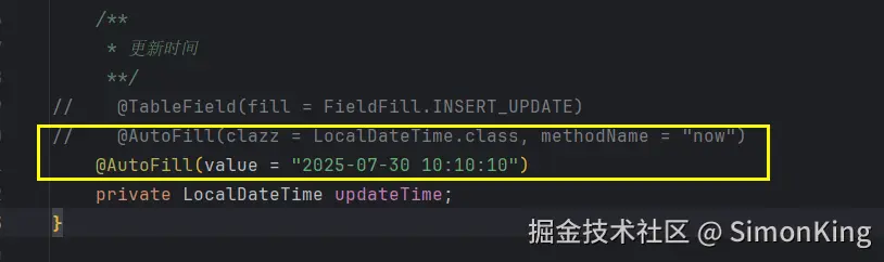 为了演示方便,这里只针对实体的updateTime字段处理,使用了硬编码。要想按照配置或者随意指定,可以配置自定义注解打标签,这里然后统一处理即可。