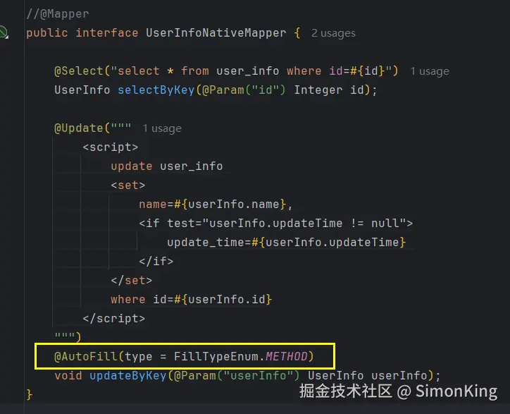 这里使用了注解的方式,如果updateTime不为空,才会更新。