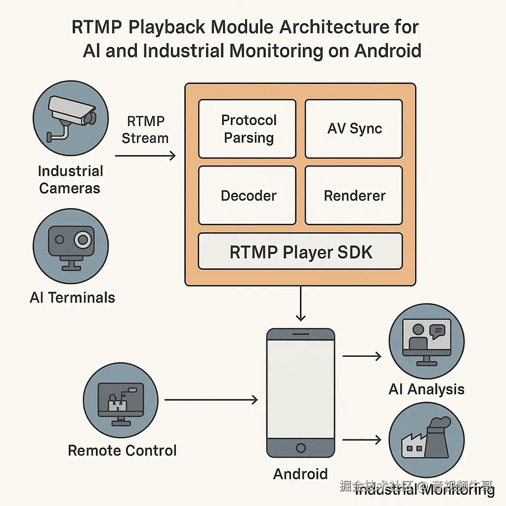 随着 AI 视频理解能力提升,很多边缘端或终端设备(如安防摄像头、巡检机器人)通过 RTMP 将原始码流推送至移动终端进行“低延迟预览 + AI识别”。