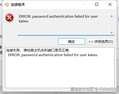 5.1、错误代码:ERROR: password authentication failed for user kaiwu