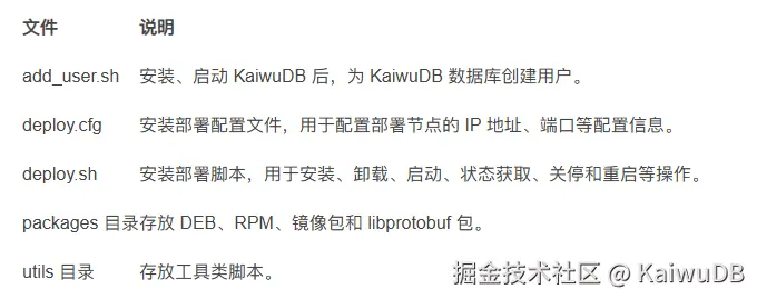 安装时,KaiwuDB 会对依赖进行检查。如果缺少依赖会退出安装并提示依赖缺失。如果目标机器不能联网,用户需要在能联网的机器上根据目标机器的操作系统下载好所有依赖文件,然后将依赖文件复制到目标机器上进行安装。