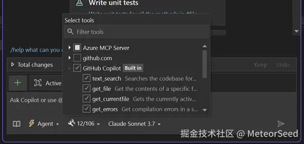 在其核心,Agent 模式使用工具调用来访问 Visual Studio 内不断增加的一系列功能。当收到一个目标时,它会逐步选择并执行合适的工具。您可以通过 Copilot Chat 窗口中的工具下拉菜单(带两个扳手的图标)来探索可用的工具。