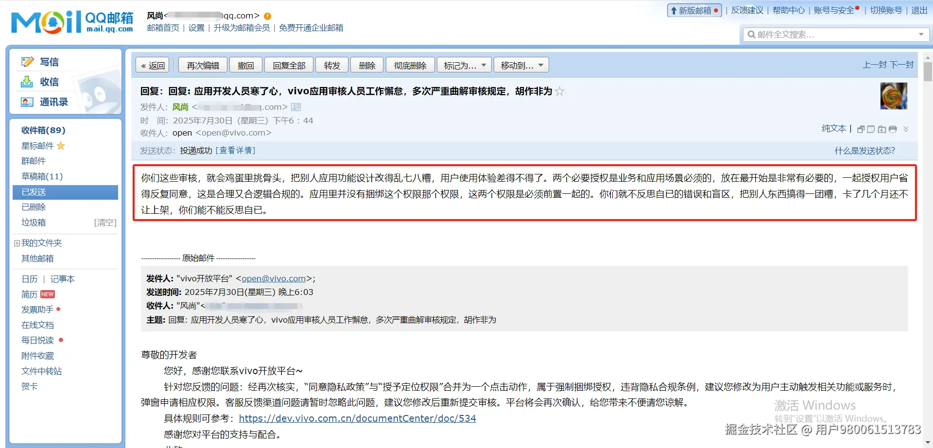 投诉完之后,有一个邮箱回复了我的消息,说是在复核此事,然后给出结论:虽然确实有申请位置权限的弹窗,但是弹窗不能在最开始一起显示。我又无语了,好不容易以为有一个能讲道理的部门人员,能够看出那些审核人员说没有位置权限申请纠正过,这么简单的事实能够认清然后还我一个公道就行了。结果事实我是对的,但是结论还是你必须驳回再修改,就像鸡蛋里没找着骨头,但是你的鸡蛋蛋黄和蛋清颜色有问题,问题是蛋黄不能是黄色,蛋清不能是白色,这种颜色不好看,是什么颜色你自已去改正。