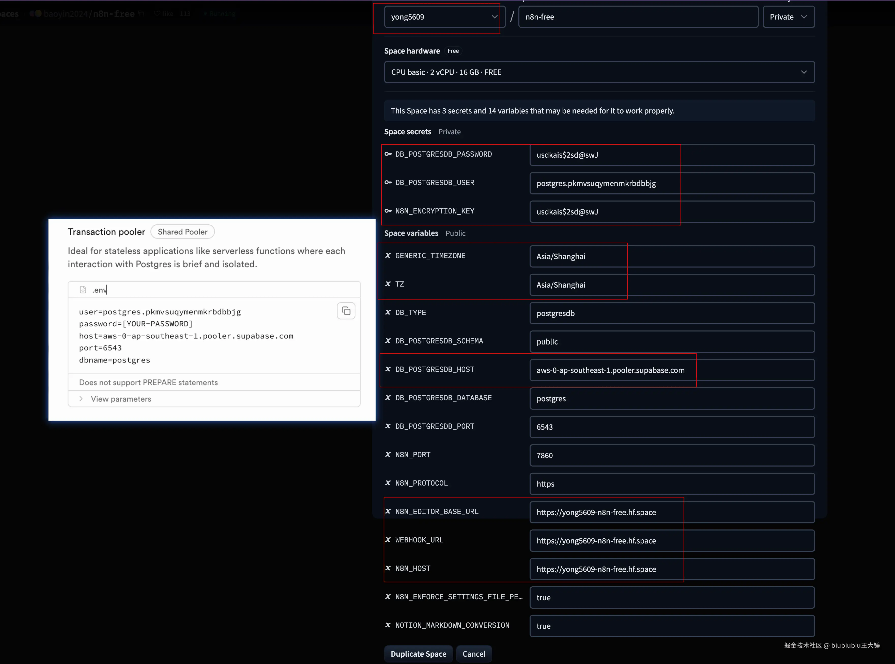 找到下方三个与 n8n 配置相关的字段,将其中的 Owner 名称替换成你自己的 Hugging Face 用户名(例如:yong5609)