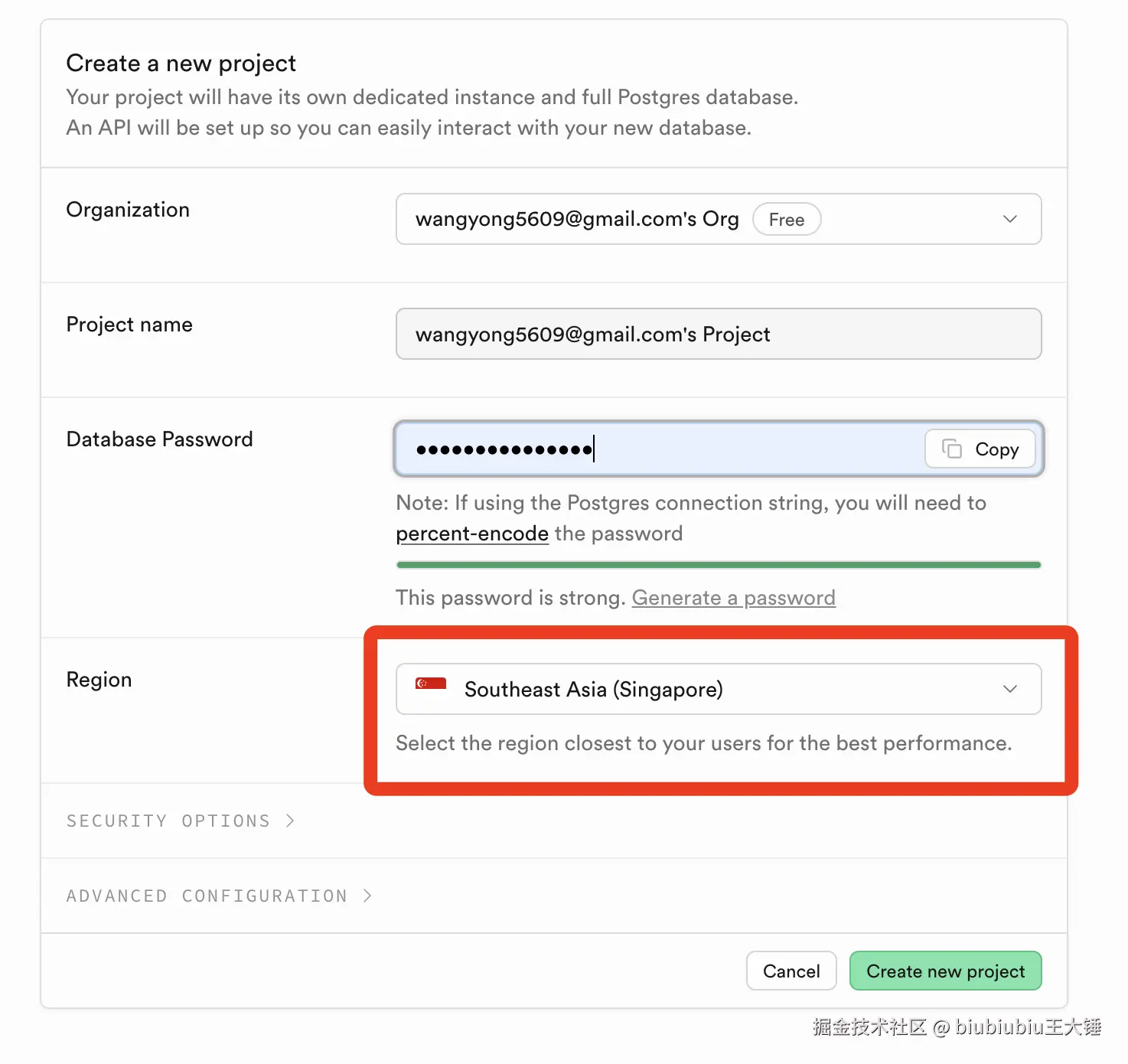 - 接下来创建项目,需要填写数据库密码,另外选择一个地区,建议选择新加坡,离得近,网络延迟更低,体验更丝滑!