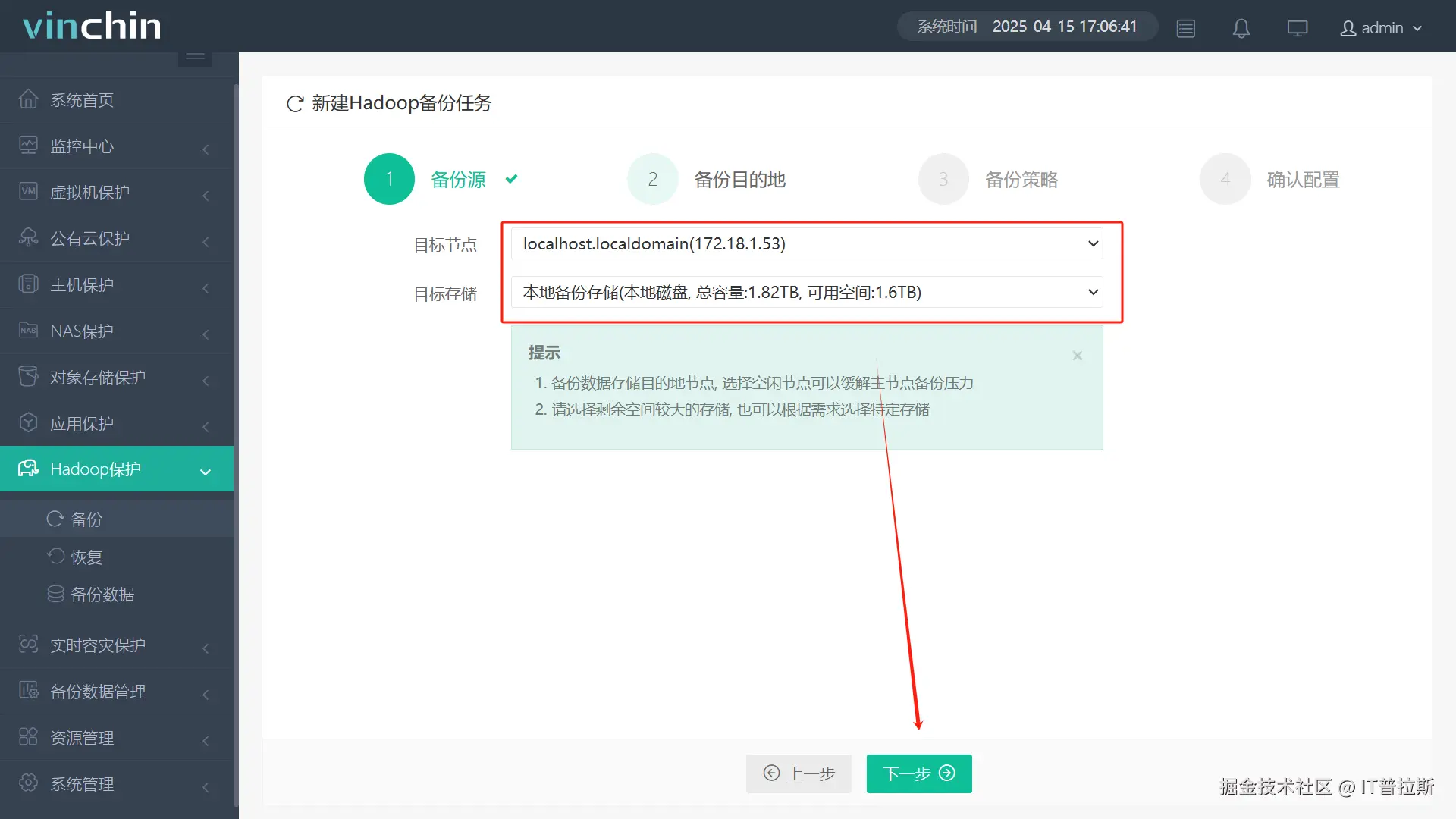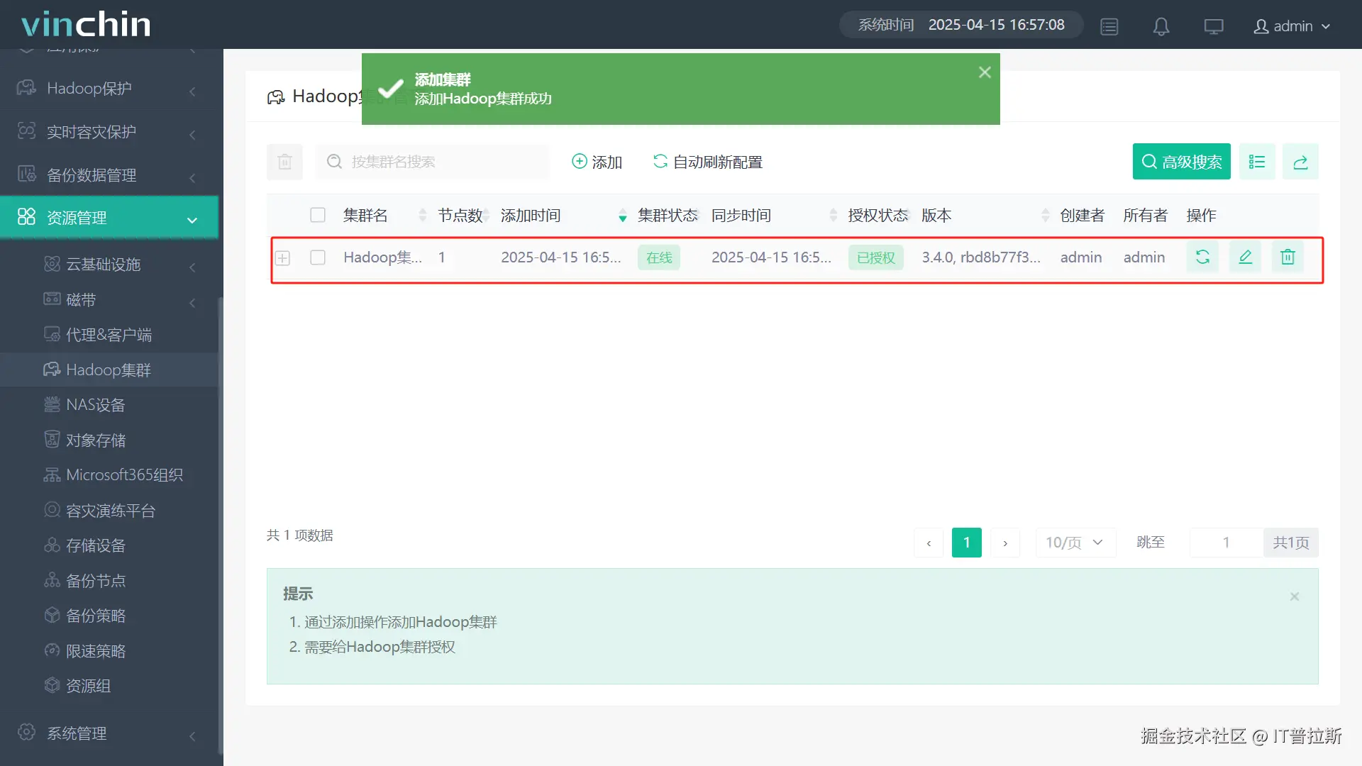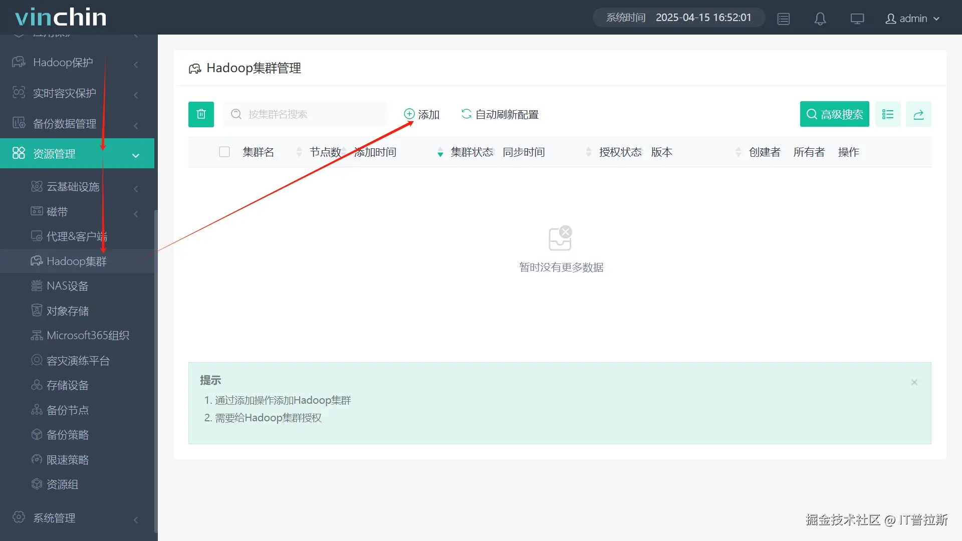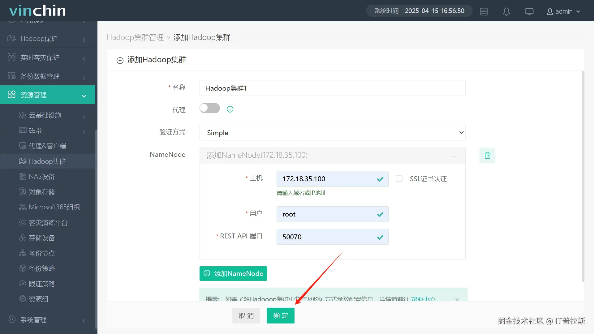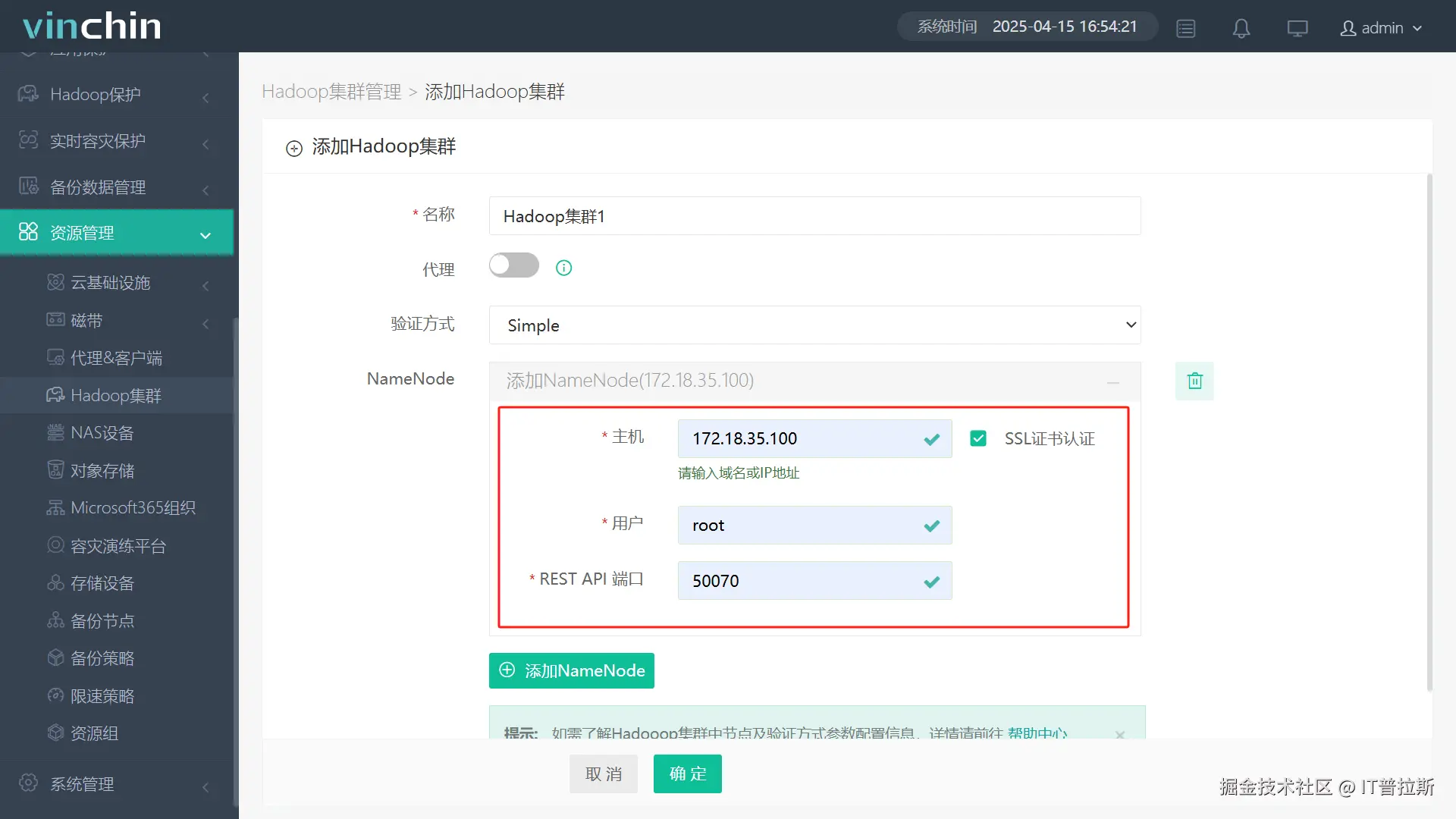 访问云祺容灾备份系统依次点击资源管理、Hadoop集群、添加,然后根据向导进行配置,如图1。