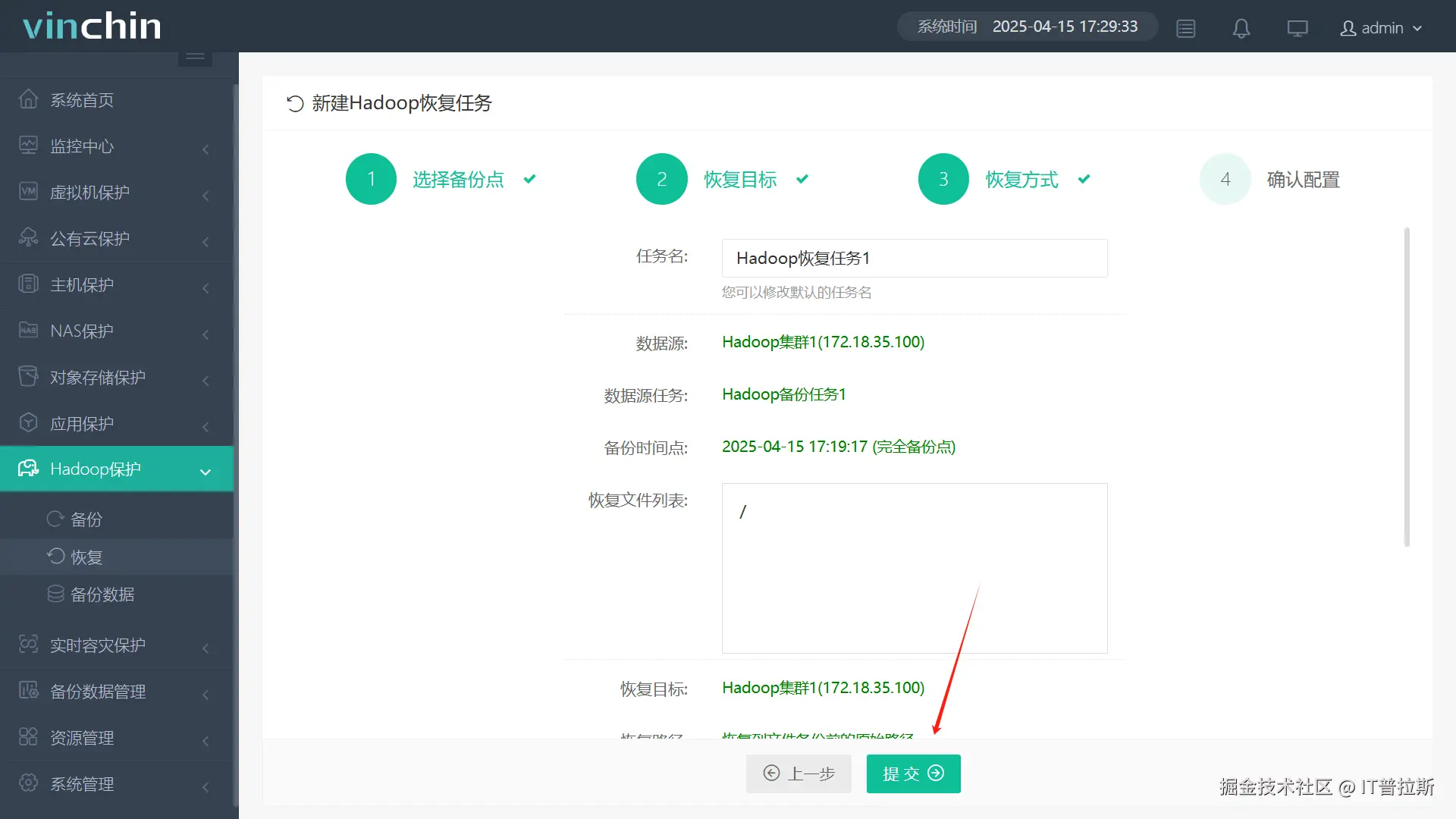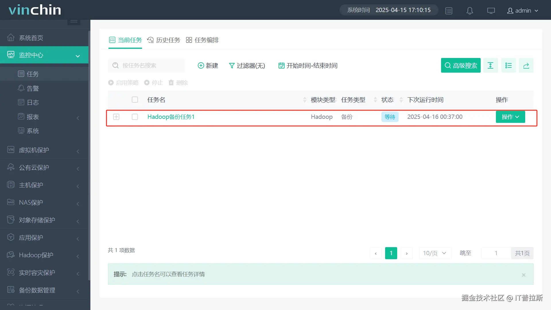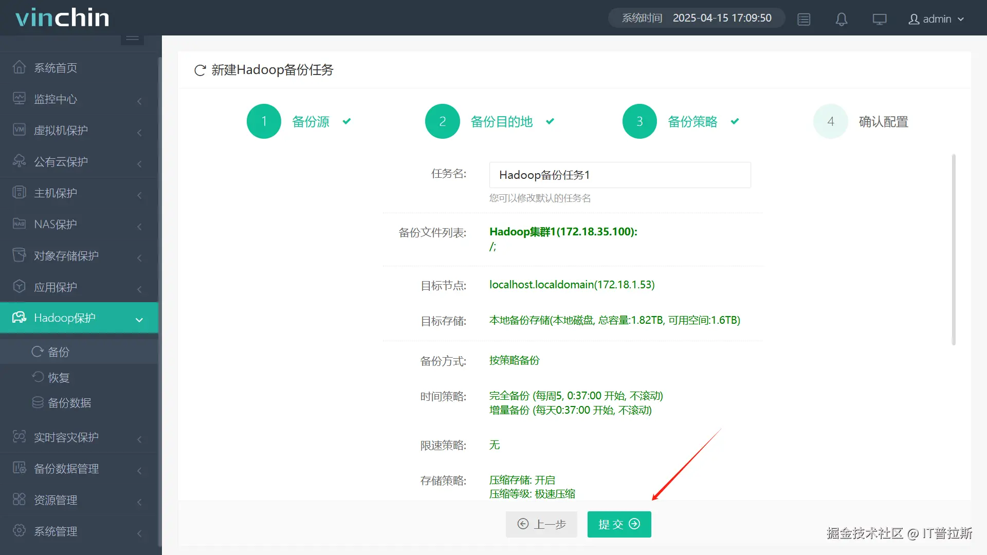 确认任务名称及任务参数,准确无误后点击提交,备份任务便创建完成了,后续备份系统将自动定时备份Hadoop上的数据,如图8、图9。