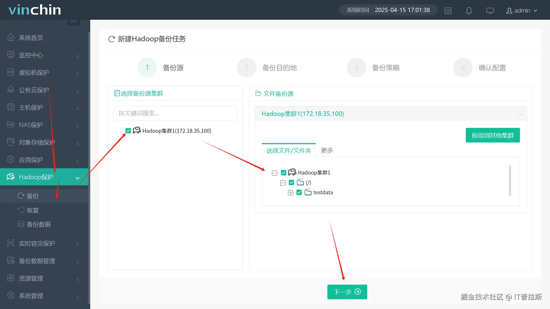 依次点击Hadoop保护、备份,选择添加好的Hadoop集群,本次演示备份整个集群,如图5。