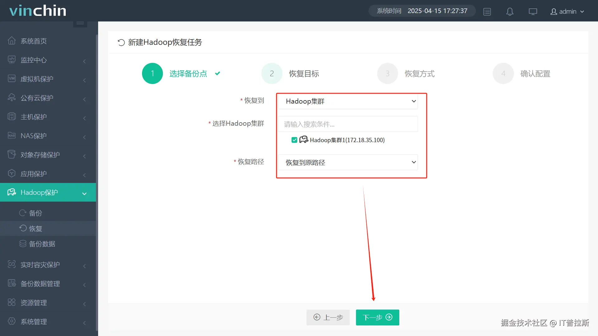 选择要恢复的位置,可恢复至原/异Hadoop集群、文件客户端、NAS设备、对象存储,本次演示以恢复至原Hadoop集群为例,如图11。