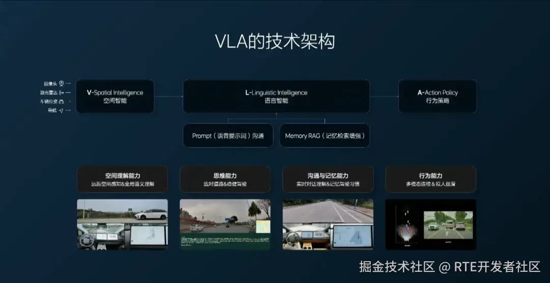 VLA 的全称是 Vision-Language-Action,是视觉-语言-动作模型。在 VLA 模型中,V 承担着空间感知的职责,通过摄像头、导航等多种输入,构建出对周围环境的理解;L 则把这种感知翻译成清晰的语言;A 指的是根据对场景的编码,生成行为策略,也就是模型该怎么开车。